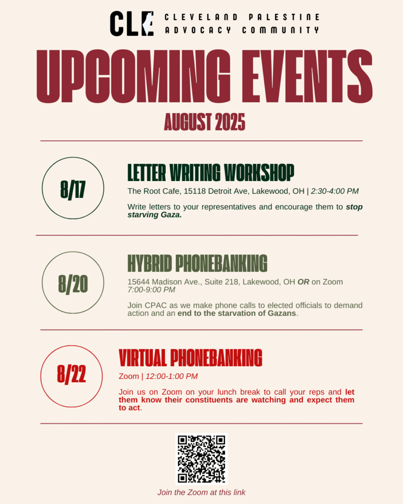 On August 20th from 7:00-9:00pm, join us for phone banking in person at Moyra’s Studio (15644 Madison Ave., Lakewood, OH) OR on Zoom. We’ll be making phone calls to elected officials to demand action and an end to the starvation in Gaza. Zoom link at the QR code above.